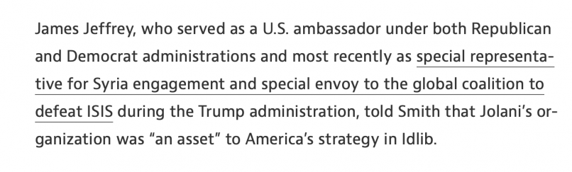 PBS recently did an interview with Abu Mohammad al Jolani, a terrorist leader in Syria’s north-western Idlib during which he expressed no intent to fight with the US, despite having a $10 million bounty on his head. The article goes on to mention how former Ambassador James Jeffrey, the US’ former Special Envoy to Syria, confirms that al Jolani’s organization Hayat Tahrir al-Sham (HTS), a rebrand of Al Qaeda, was a “an asset” to America’s strategy in Idlib.