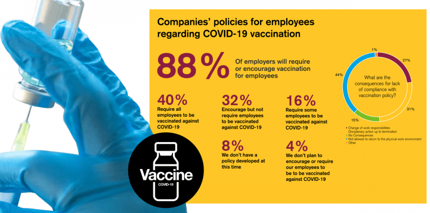 While many people can choose not to travel abroad or go to business venues that require proof of vaccination, an employer mandate could be more problematic. Arizona State said 31% of businesses plan to take disciplinary action, including possibly firing employees who refuse to comply with their vaccine policies.