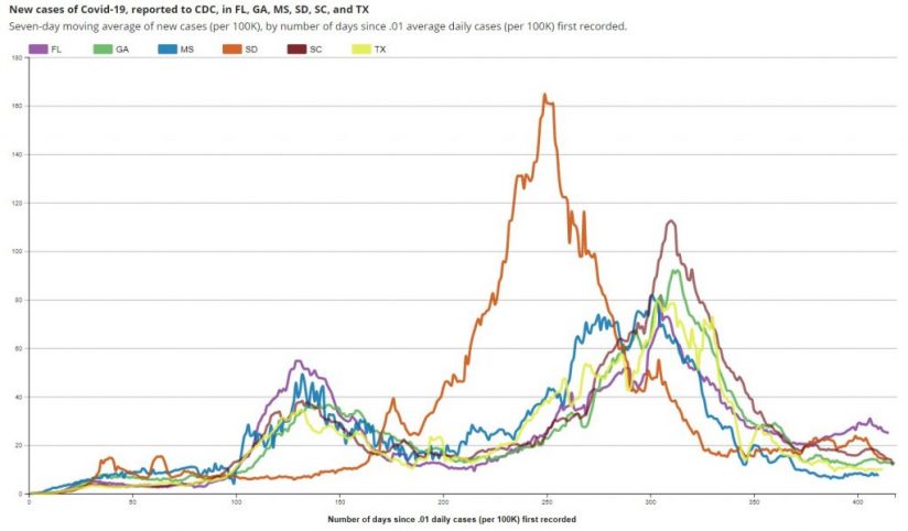 If only our media would spend as much time telling the population about how Florida lifted its restrictions back in September, how South Dakota never had any, and how Texas and Mississippi reopened in full at the start of March, as they do telling us about how many people are in hospital in Delhi. The latest positive-test data for these open states is in the graph above, along with two other light-restriction states, South Carolina and Georgia. Note the conspicuous lack of surge despite being basically back to normal. What more evidence do our politicians and scientists need that the threat from the virus is overblown and does not warrant social restrictions or emergency measures? Is the Government interested in data which contradict their preferred narrative?