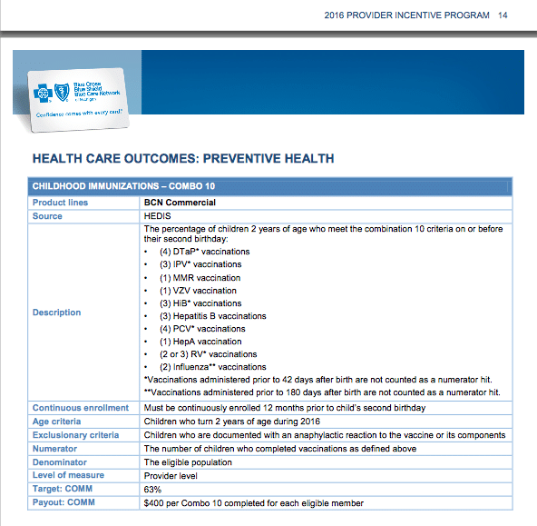 BCBS outlines the incentive program for vaccinating babies in the BCBS doctor incentives booklet. Below is an image of the childhood immunization incentives page.