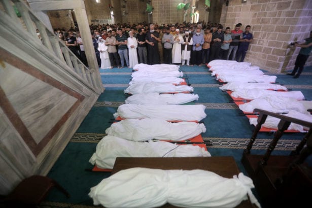 Mourners pray over the bodies of Palestinians killed in overnight Israeli airstrikes in Gaza City on 16 May. (Atia Darwish APA images)