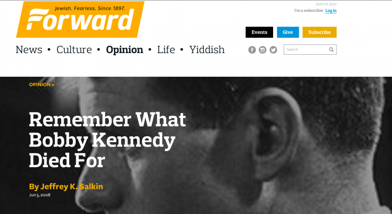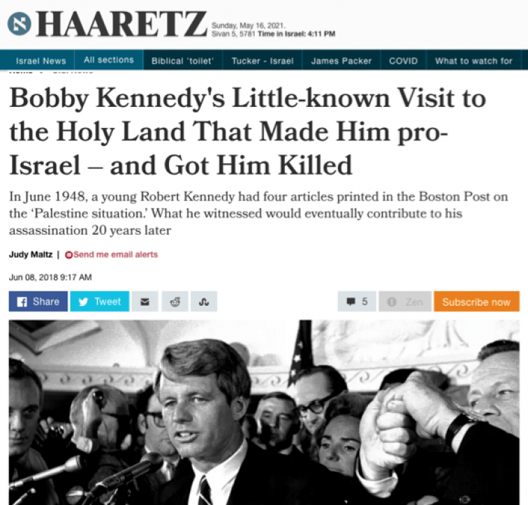 And so, the Forward insists: “One cannot help but note the parallel between [Robert] Kennedy’s assassination and the terrorist attacks of September 11, 2001. In both tragic cases, Arab fanaticism reared its ugly head on American soil, irrevocably changing the course of events in this country.”[5] And the lesson: “In remembering Bobby Kennedy, let us remember not just what he lived for, but also what he died for — namely, the precious nature of the American-Israeli relationship.”[6] In other words: let’s propagate the narrative, for it is good for Israel.