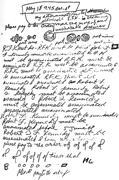 Even if we assumed that Sirhan did kill Robert Kennedy, a second aspect of the case raises question: Sirhan seemed to be in a state of trance during the shooting, and of disorientation just after. More importantly, Sirhan has always claimed that he has never had any recollection of his act. Fifty years after the facts, he continues to declare: “I was told by my attorney that I shot and killed Senator Robert F. Kennedy and that to deny this would be completely futile, [but] I had and continue to have no memory of the shooting of Senator Kennedy.” He also claims to have no memory of “many things and incidents which took place in the weeks leading up to the shooting.”[17] Some repetitive lines written of a notebook found in Sirhan’s bedroom, which Sirhan recognizes as his own handwriting but does not remember writing, are reminiscent of automatic writing: there is a whole page of fifteen repetitions of “RFK must die, Robert F. Kennedy must be assassinated, assassinated, assassinated, assassinated,” suddenly turning to “I have never heard please pay to the order of of of of of.”[18]