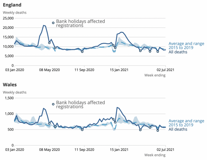 Today the ONS announced that there were 8,808 deaths in England and Wales in the week ending 2nd July 2021. This is 118 more than the previous week, but still 5.2% below the five-year average. Here’s the chart from the ONS: