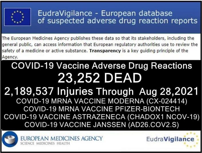 The EudraVigilance database reports that through August 28, 2021 there are 23,252 deaths and 2,189,537 injuries reported following injections of four experimental COVID-19 shots: