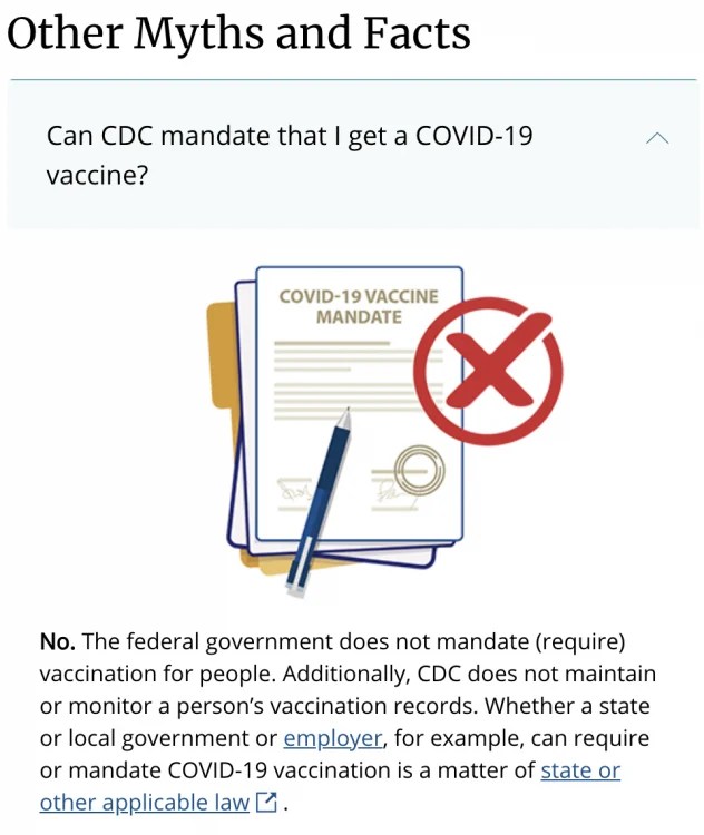 During the last 18 months, social media platforms have often used the recommendations of the CDC as a basis of censorship online. The CDC’s own “Myths and Facts” section explained clearly, and still does at the time of publication, that the federal government does not mandate vaccines and that it’s a matter for states and local governments.
