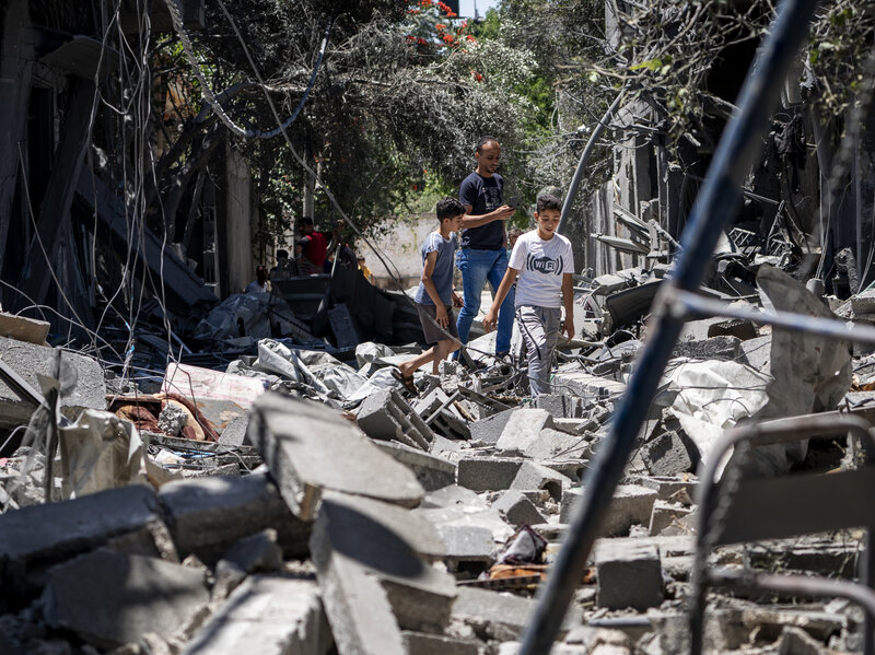 Gazan children walk among the rubble of a building destroyed by an airstrike, May 24, 2021, in the Gaza Strip. (John Minchillo, AP)