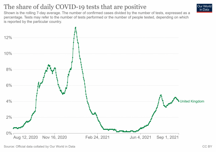 While the U.K. has seen a spike in reported ‘cases’ in recent days, much of it is driven by the increase in testing as schools have returned. The positive rate, by contrast, shows a gentle decline.