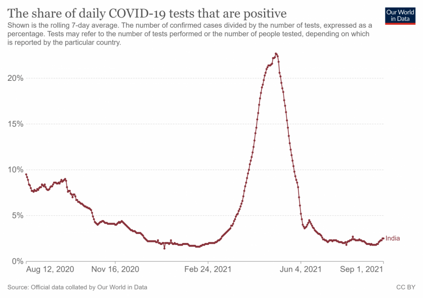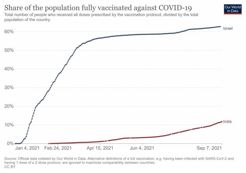 India, by contrast, is a low vaccination country which only recently broke through 10% double vaccinated.