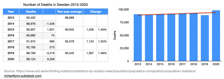 The number of people who die in Sweden, after making some adjustments for “good” and “bad” flu years, increases by about 1,200 every couple of years. That’s partly because the population is increasing, partly because the population is ageing, and partly because the population is changing through immigration. It would have been astonishing if the number of people who died in Sweden in 2020 hadn’t increased.