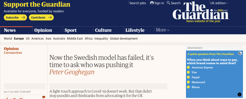 Let’s remind ourselves of how one leading COVID catastrophists’ newspaper-of-record reports to its readers a death rate rise in Sweden that is barely distinguishable from noise, while inciting a McCarthyist witch-hunt against those who favoured Sweden’s approach:7