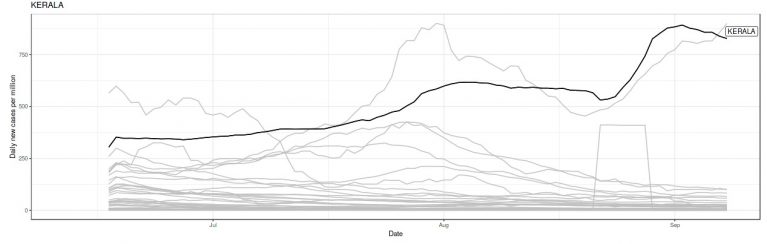 If you’re wondering about the small recent rise in India, it’s entirely concentrated in two states (on opposite sides of the country), Kerala and Mizoram, which stand out as having had very different reported infection patterns than the rest of the country since late July. As can be seen below, Kerala is now declining again while Mizoram (the other anomalous line) is behaving more erratically. This is not (yet) a new nationwide surge in infections then, though is worth keeping an eye on.