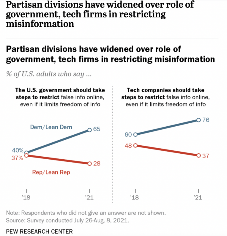 A Pew survey from August shows that Democrats now overwhelmingly support internet censorship not only by tech giants but also by the government which their party now controls. In the name of “restricting misinformation,” more than 3/4 of Democrats want tech companies “to restrict false info online, even if it limits freedom of information,” and just under 2/3 of Democrats want the U.S. Government to control that flow of information over the internet: