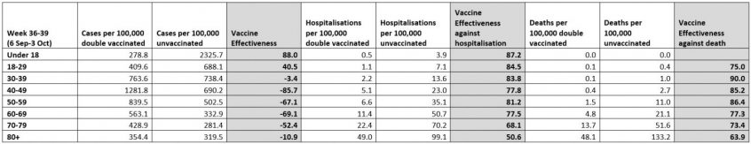 So here, without further ado, is the table with the latest unadjusted vaccine effectiveness estimates, for the period September 6th to October 3rd. (For the previous three tables see my previous post.)