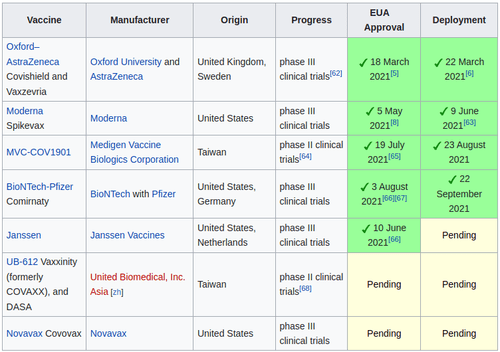 Taiwan’s vaccination campaign began much later than many other nations, a lag which many blame on political interference from China which was best illustrated by the island nation’s difficulties procuring orders of Pfizer-BioNTech’s mRNA vaccines. Despite these hurdles, the country was at first able to procure 117,000 doses of AstraZeneca’s vaccines. Additional deliveries of 200,000 and 400,000 doses from the same manufacturer arrived the following two months before another 150,000 vaccines from Moderna were delivered in May 2021. It gave emergency approval to a domestically engineered alternative made by Medigen Vaccine Biologics Corporation with shipments from Pfizer-BioNTech and Johnson & Johnson soon following. As of October 11, 4.48 million Taiwanese, about 19% of the population, have been fully vaccinated and 13.7 million, or about 59% of population, have received one dose. The country has stated that it seeks to have 70% of its population fully vaccinated.