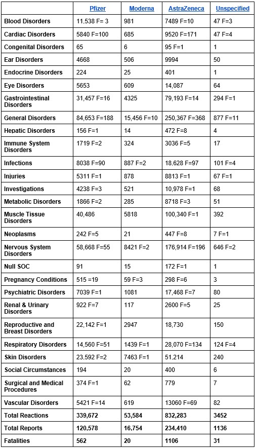 Source: Pfizer; Moderna; AstraZeneca; Unspecified. “F” denotes fatal.