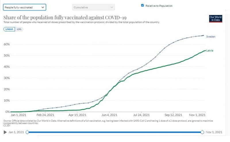A possible argument in defense of Latvia’s Covid record could be that comparison to Sweden is not fair given the latter’s much higher vaccination rate.