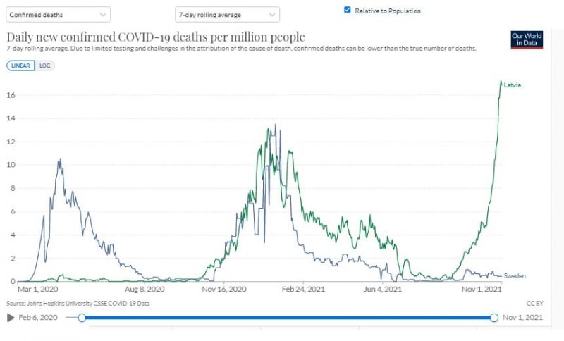 That argument doesn’t hold up because Sweden faced both of its major outbreaks before vaccines were a factor. Meanwhile, Latvia has only hit its biggest outbreak now that many of its residents have vaccine protection.