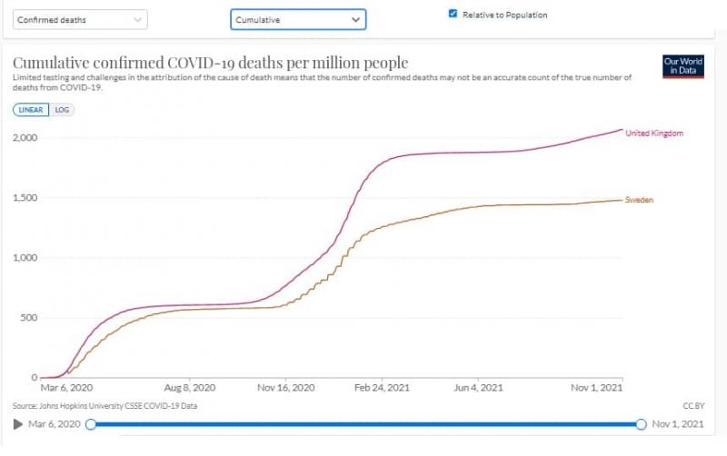 That trio indeed had a better Covid outcome (if not a better rights, dignity, and calmness outcome) than Sweden, which supposedly means that if Sweden had locked down as they had it would have likewise experienced similarly low Covid deaths. What is the proof of that? If lockdowns “mitigate” Covid deaths then why wasn’t the UK with its even more Draconian lockdown able to replicate low Norwegian and Finnish numbers? Why wasn’t lockdown UK able to show Sweden “how it’s done” and embarrass her? (Or lockdown world leader Peru for that matter which is instead nonetheless also world’s Covid deaths leader.) Why didn’t lockdowns work in the UK, but would have in Sweden?