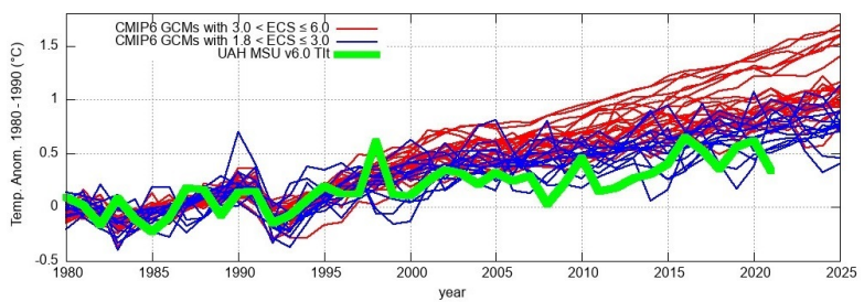 At the heart of the climate model problem is determining the equilibrium climate sensitivity (ECS). This is defined in climate science as the increase in the global mean surface temperature that follows a doubling of atmospheric CO2. Nobody knows what this figure is – the science for this crucial piece of the jigsaw is missing, unsettled you may say. So guesses are made and they usually range from 1C to as high as 6C. Models that use a higher figure invariably run hot and Professor Scafetta has proved them to be the least accurate in their forecasts.