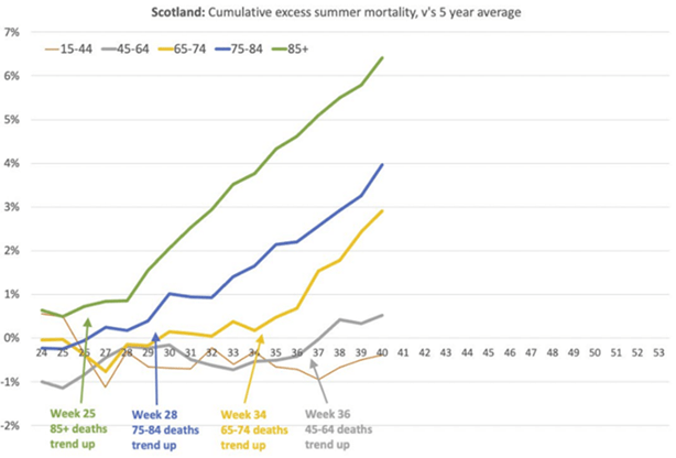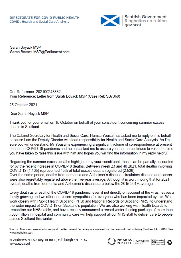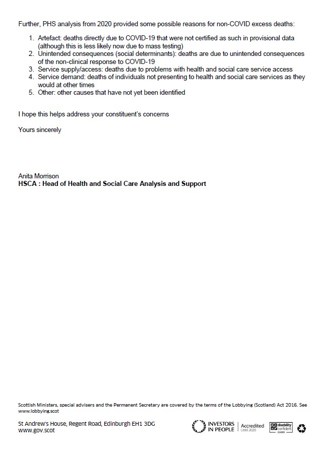 I am very grateful for your response to my original letter. It has been extremely helpful in crystalising my thoughts about the causes of the dramatic and continuing rise in excess deaths that we currently see in Scotland. My conclusion is that whatever the true explanation for the phenomenon, it is rooted in the misguided and disastrous public health policies of the Scottish Government. The analysis has moreover highlighted that a significant contributor to the excess death of the Scottish population this summer may be adverse reactions to the COVID-19 vaccines, a factor that apparently has not occurred to either the Scottish Government or yourself. I would be grateful if you would pass on this insight to the Scottish Health minister so that unnecessary suffering and death is not meted out on the adults, and now children of Scotland.