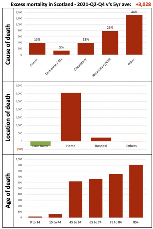 Let us now turn to the majority of excess deaths that cannot be accounted for by Covid. I will be using the most up to date figures from the National Records of Scotland for the summer period 2021 up to week 42 that indicate 3,028 excess deaths (rather than your figures that extend only to week 40). The National Records of Scotland classify these deaths according to their causes, location and age. This is illustrated below.