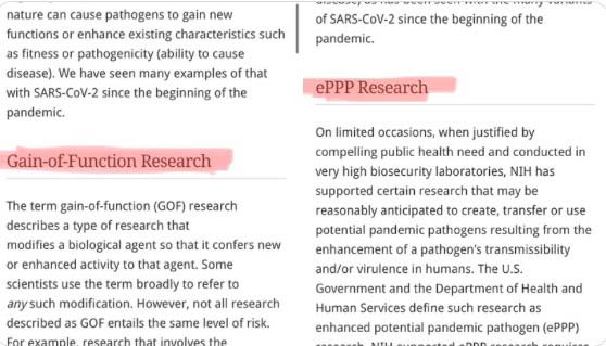 Adding fuel to suspicions that the NIH/NIAID are trying to cover their tracks is the fact that the NIH suddenly, in the third week of October 2021, deleted the definition of GOF from its website, replacing it with a section on enhanced potential pandemic pathogens (ePPP) research.27