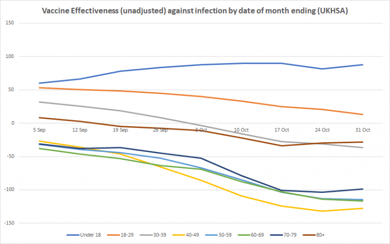 Here’s this week’s table of unadjusted vaccine effectiveness and the updated graphs showing how it is changing over time. It shows infection rates currently twice as high in the vaccinated compared to the unvaccinated for those aged 40-79, corresponding to an unadjusted vaccine effectiveness of minus-100% or more. Vaccine effectiveness is negative for all over-30s, and almost zero for those aged 18-29 (and still declining). It remains high for under-18s, and effectiveness against hospital admission and death is holding up. This week the decline appears to have stopped, or at least paused, in most age groups.