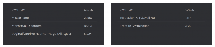 - Female reproductive issues top the list. These are strongly elevated by these vaccines. Many of the top symptoms are all related to the menstrual process.