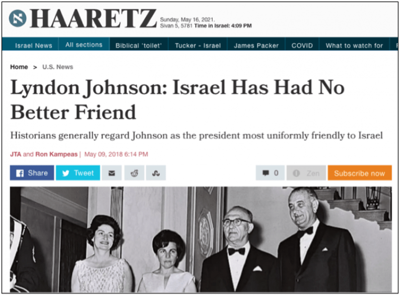 So, since the assassination of Kennedy was a coup to put Johnson in power—what else can it be?—there was no time to waste: it had to be done before the new campaign started and news of a change of vice-presidential ticket was published (Nixon’s prediction was the first and the last). If we now want to know the motive of the coup, we only have to ask: What major change occurred in US policy under Johnson? The change was not visible to the American public then, but they are now well-known, at least to readers of the Jewish and Israeli press. “Lyndon Johnson: Israel Has Had No Better Friend,” headlined Haaretz on May 9, 2018.
