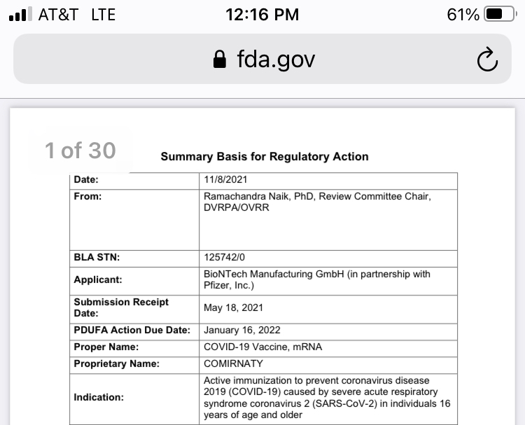 On November 8, the agency released its “Summary Basis for Regulatory Action,” a 30-page note explaining why on August 23 it granted full approval to Pfizer’s vaccine, replacing the emergency authorization from December 2020.