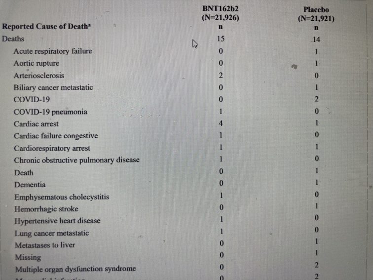 These were not just Covid deaths. In fact, they were mostly not from Covid. Only three of the people in the trial died of Covid-related illnesses – one who received the vaccine, and two who who received the saline shot. The other deaths were from other illnesses and diseases, mostly cardiovascular.