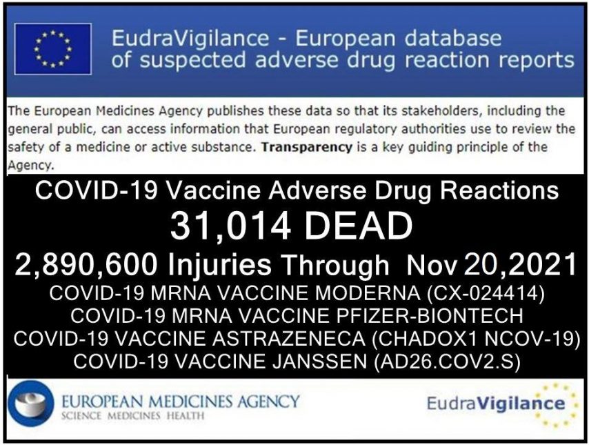 The EudraVigilance database reports that through November 20, 2021 there are 31,014 deaths and 2,890,600 injuries reported following injections of four experimental COVID-19 shots: