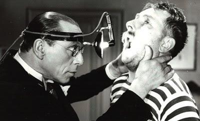 I was reminded of Dr. Knock, the central character of Jules Romains’s famous novel Knock or the Triumph of Medicine, written in 1923. Dr. Knock is a shady medical doctor of dubious competence who professes that “health” is an obsolete and unscientific concept, and that all men are sick and need to be informed about it by their doctor. To advance his plan of converting a whole town into permanent patients, he enlists the help of the school teacher and of the pharmacist, who suddenly sees his clientele booming (watch unforgettable moments of Guy Lefranc’s 1951 film adaptation with Louis Jouvet here and here).