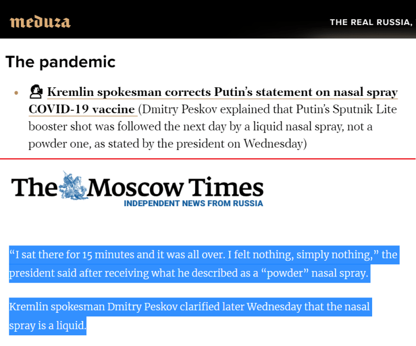 Your humble Moscow correspondent recently reported on Vladimir Putin’s mystifying tale about receiving an intranasal COVID vaccine as part of a clinical trial. As you might recall, Russia’s president claimed he inhaled some kind of virus-murdering powder via a syringe. But the drug he allegedly took is actually a liquid nasal spray. No powder was involved. We thought it was funny that Putin said something so insane and made jokes alluding to illicit drug usage.
