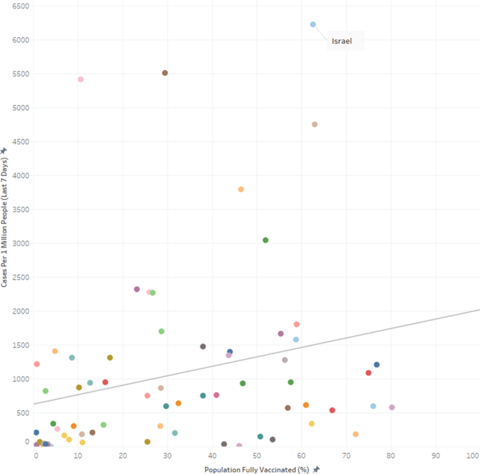 The lack of a meaningful association between percentage population fully vaccinated and new COVID-19 cases is further exemplified, for instance, by comparison of Iceland and Portugal. Both countries have over 75% of their population fully vaccinated and have more COVID-19 cases per 1 million people than countries such as Vietnam and South Africa that have around 10% of their population fully vaccinated.”