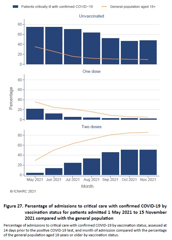 The latest report from ICNARC shows that of Covid ICU patients in England, Wales and Northern Ireland, 50.5% in October and 50.7% in November were double vaccinated. Add to that the 2.8% in October and 1.8% in November who were single-vaccinated and you get overall vaccinated proportions of 53.3% in October and 52.5% in November. That compares to 46.7% unvaccinated in October and 47.5% in November. Note that the unvaccinated here includes people who received a vaccine less than 14 days prior to the positive Covid test, so includes some (an unknown number) who are actually single vaccinated.
