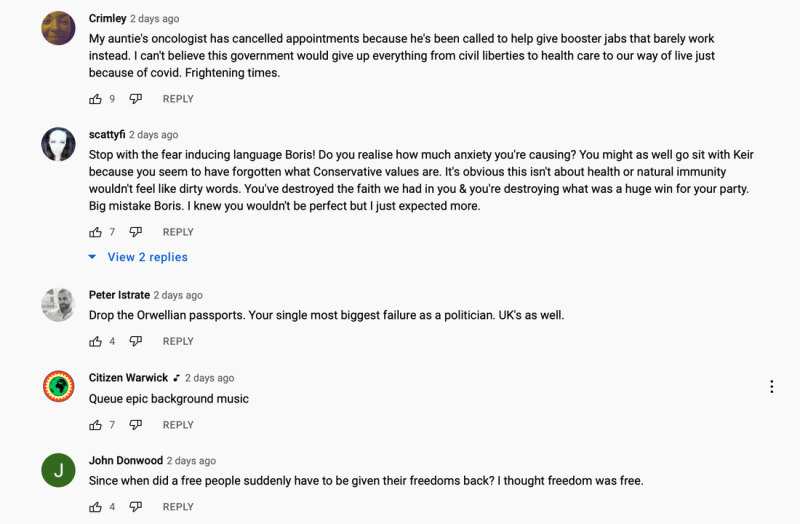 10 Downing Street released a nugget sized version of Johnson’s Omicron announcement on Youtube, with a tight crop and dramatic music. The selected few dramatic sentences could have been borrowed from a disaster genre ‘B’ movie. I’m not sure if Youtube comments are more or less valid than Yougov, but they are certainly revealingly scathing about “fear inducing language”, “Orwellian passports” and NHS queues.