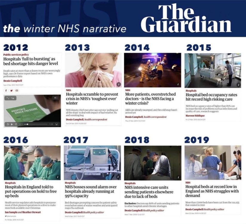 It’s also worth remembering that the NHS has a beds crisis every winter, as this selection of Guardian headlines illustrates. (See also the image at the top of headlines from the 2017-18 winter crisis.)