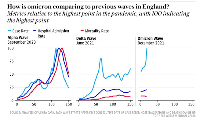 This graph is from the Telegraph 2 days ago, and it shows that hospitalizations and deaths have not paralleled the rise in cases for Omicron, as they did for earlier waves.