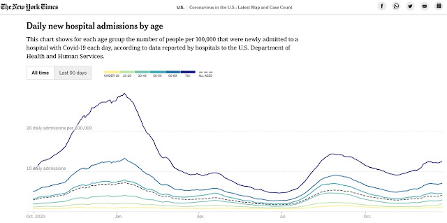 The second graph shows hospitalizations [with Covid] over time by age from today’s NY Times. The yellow line is pediatric ages. While I have not posted a “cases” graph, cases have shot up, while hospitalizations and deaths have not shot up proportionately, as happened in the US with prior waves.