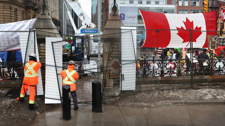 Video footage captured on Thursday showed busloads of police arriving in downtown Ottawa, and officers purportedly holding crowd control drills. Meanwhile, workers were seen putting up metal fencing near the demonstration, which has brought traffic in the center of the Canadian capital to a standstill for nearly three weeks now.