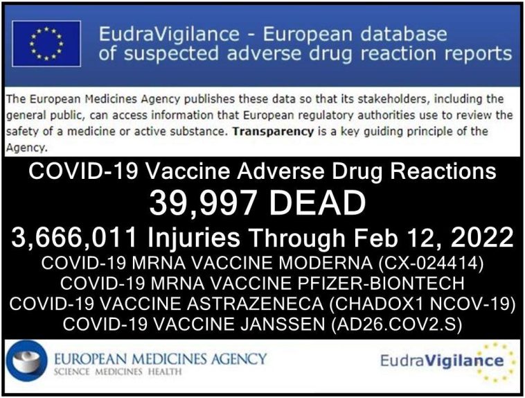 The European (EEA and non-EEA countries) database of suspected drug reaction reports is EudraVigilance, verified by the European Medicines Agency (EMA), and they are now reporting 39,997 fatalities, and 3,666,011 injuries following injections of four experimental COVID-19 shots: