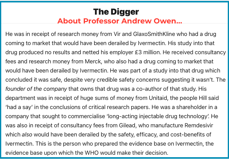 Professor Andrew Owen is the person who allegedly edited the critical Andrew Hill paper on Ivermectin. He was also in receipt of consultancy fees from pharmaceutical companies with competing products.