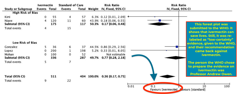 — A paper considering these many studies was written by lead author Dr. Andrew Hill at the University of Liverpool for the World Health Organization’s COVID Guideline Development Group. Hill was an early and vigorous proponent for ivermectin. His paper showed that ivermectin could reduce deaths by 75% if used throughout the world.