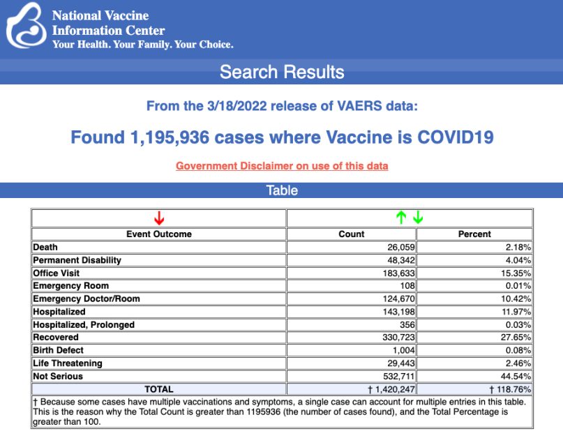U.S. VAERS data from Dec. 14, 2020, to March 18, 2022, for all age groups combined, show: