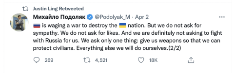 It’s understandable that these concepts might be confusing for Ling. Because around the same time as he was carefully monitoring my Twitter feed for incriminating signs of “disinformation” offenses, take a wild guess at what Ling was also doing. Go ahead. If you guessed “uncritically disseminating the propaganda of a warring party” — you would be correct. Here’s the intrepid investigative journalist in action, dutifully amplifying a call from one of Zelensky’s official advisors for provision of more US/NATO weaponry: