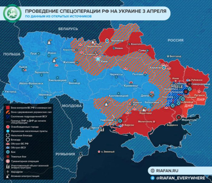 The above map reproduced from the Novosti (unfortunately, in Russian language) on the exact ground situation as of April 3 and the commentary by Ivan Andreev, an experienced war correspondent who covered the Russian operations in Syria, gives the salience of the cauldron in Donbass where the crème de la crème of the Ukrainian forces numbering several divisions are entrapped, isolated by opposing forces from their logistical base and other friendly forces.
