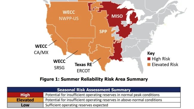 The North American Electric Reliability Corporation, a non-profit regulator for U.S. grid operators, issued a first of its kind Summer Reliability Assessment warning that the Midcontinent Independent System Operator (MISO), which operates the power grid across 15 states, is at “high” risk of failing to meet energy demand, which may lead to “forced outages.”