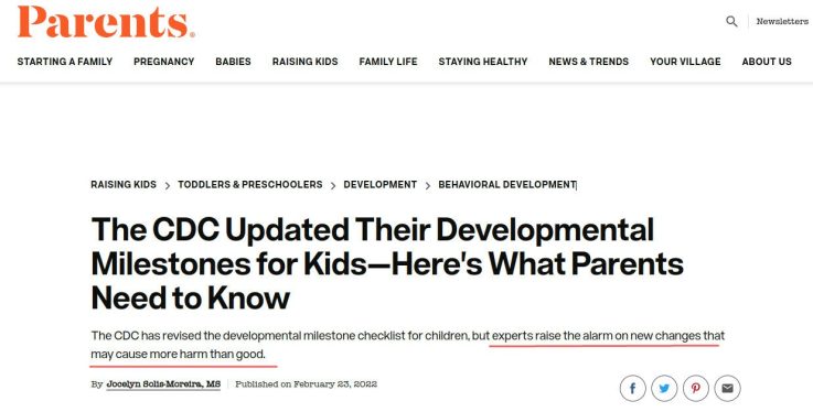 The CDC possibly caught a whiff of this, because in February of 2022 they literally removed half the developmental milestones, bumped some others to higher ages, and lowered standards for yet more of them. (Hat tip @CLesterwood)